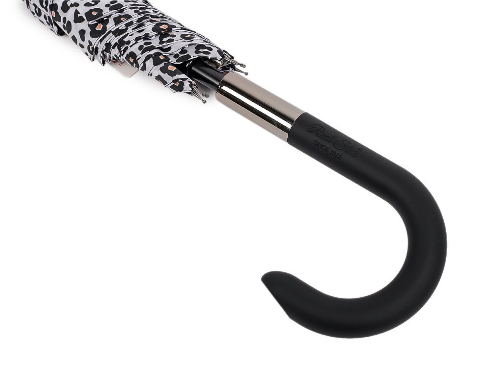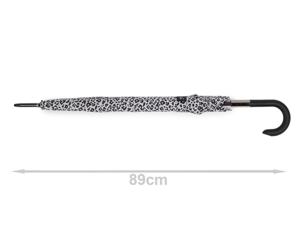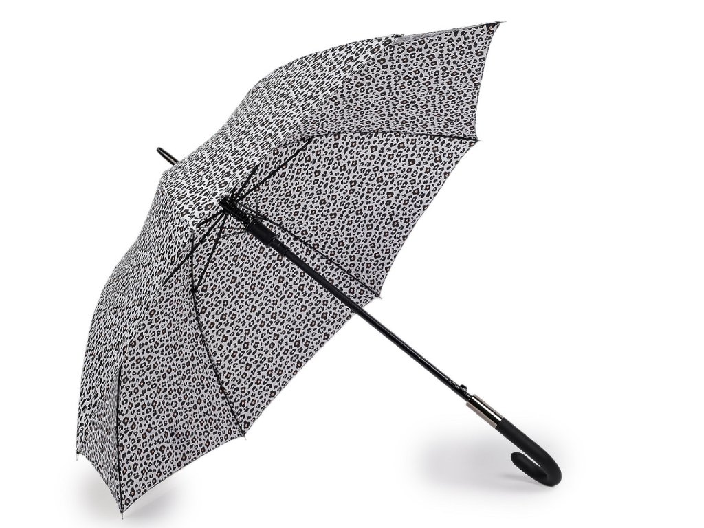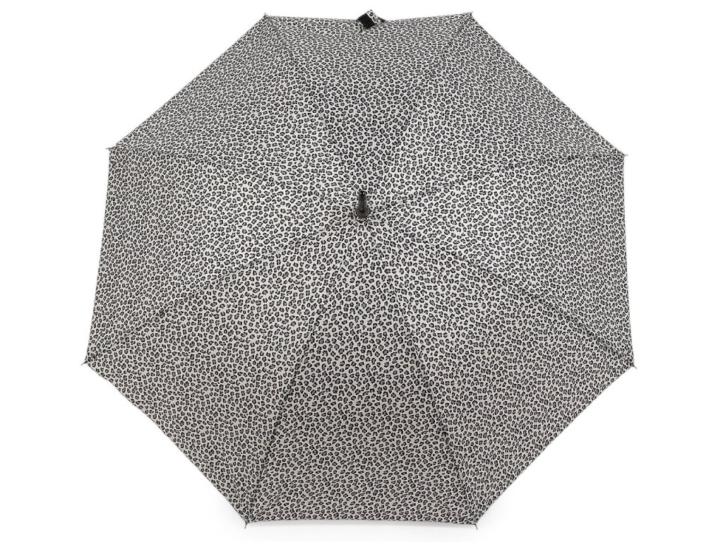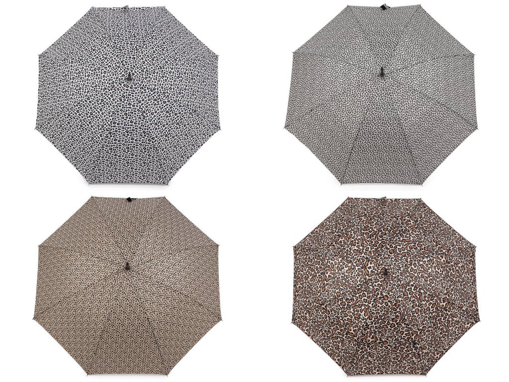 Velký dámský deštník se zvířecím vzorem je stylovým a praktickým doplňkem pro každou ženu. Díky svému atraktivnímu designu, dodá šarm i těm nejzamračenějším dnům. Je vystřelovací, konstrukci má z kovového drátu a pružných lamel, které tvoří osm polí. Díky nim je velice pevný, neohne se ani za největšího nečasu. UV filtr vás ochrání před slunečním zářením. Klasická tyč je zakončená pevnou rukojetí.