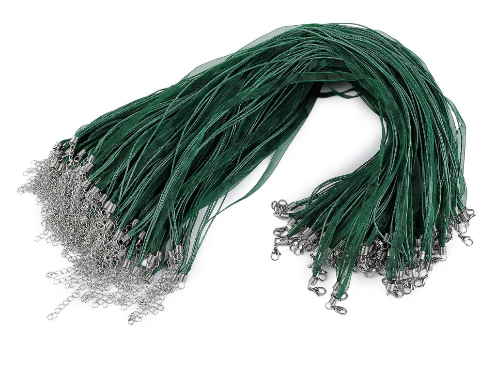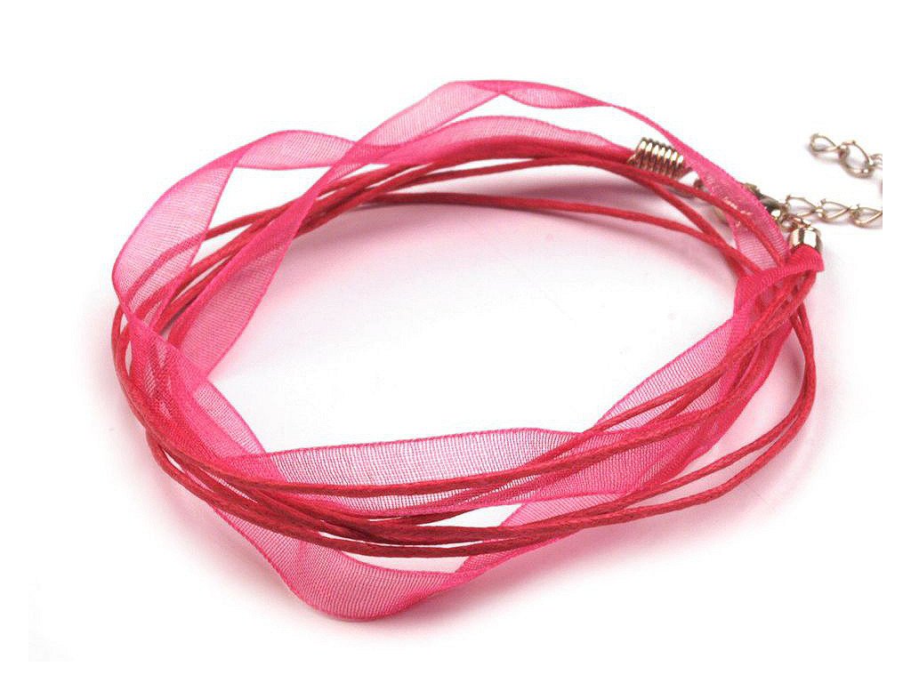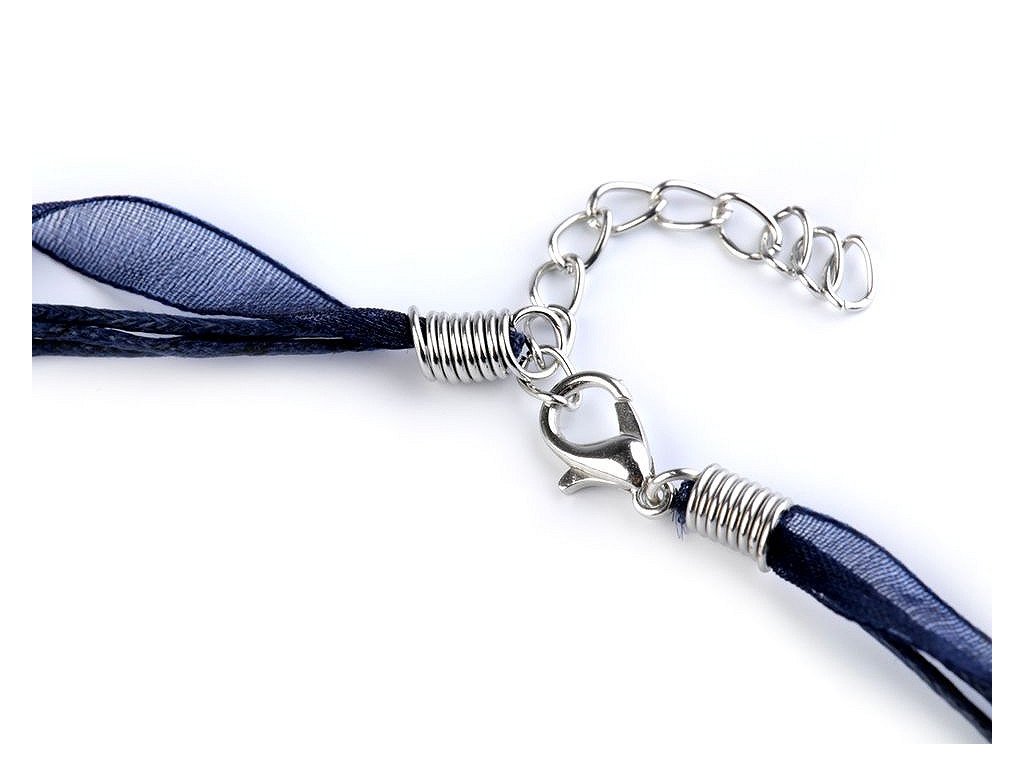 Hotový závěs z organzové stužky a tří voskovaných šňůrek je velice oblíbený. Stačí na něj zavěsit koupený nebo vlastnoručně zhotovený přívěsek. Zapíná se na klasickou karabinku a prodlužovací řetízek z nerezové oceli. Upozorňujeme zákazníky, že typy koncovek se mohou lišit, mohou být kulaté nebo ploché.