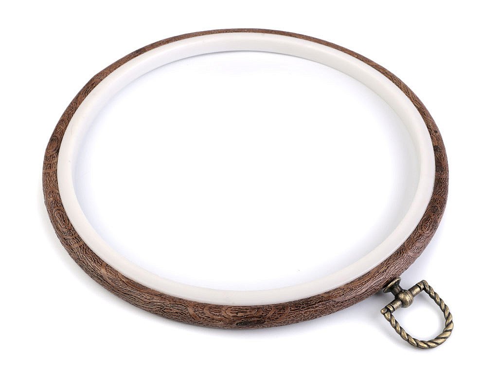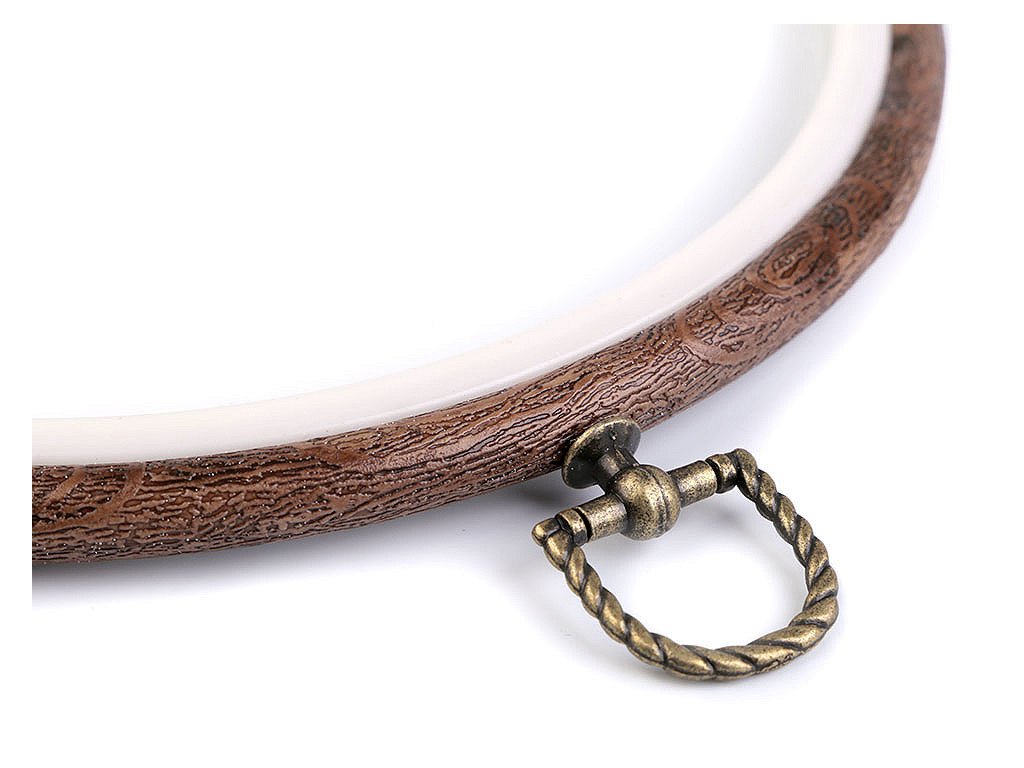 Vyšívací kruh je vyrobený z pryže, ktorá imituje drevo, a plast. Je vybavený kovovým šrobkom, pomocou ktorého môžete kruh zavesiť na stenu.
